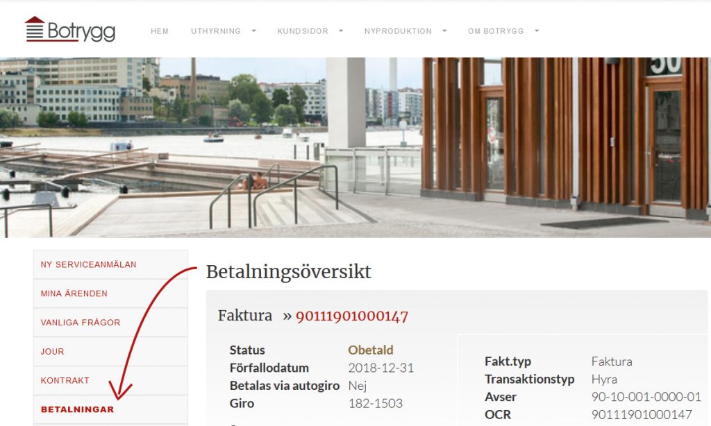 Du vet väl att du kan se dina hyresavier om du loggar in på dina kundsidor? Under fliken betalningar lägger vi omkring den 15:e i varje månad upp allt du behöver för att betala din hyra.